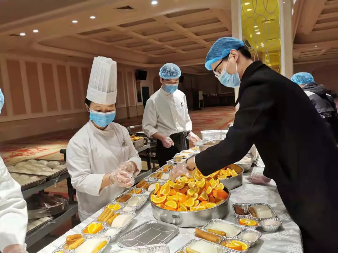 为了保障广东医疗队人员地域口味,酒店制定专属膳食,出品每日每餐轮换,提供果汁、维他奶等各类饮品,同时在取餐处安置保温车,保证出品温度。